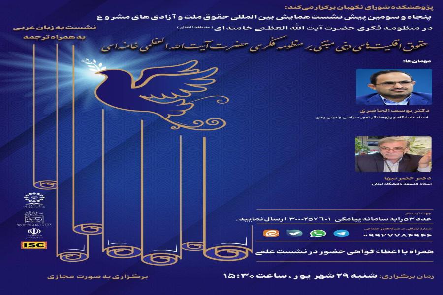 پنجاه و سومین پیش نشست همایش بین المللی حقوق ملت و آزادی های مشروع در منظومه فکری حضرت آیت الله العظمی خامنه ای (مدظله العالی) با موضوع: «حقوق اقلیت های دینی از دیدگاه حضرت آیت الله العظمی خامنه ای»
