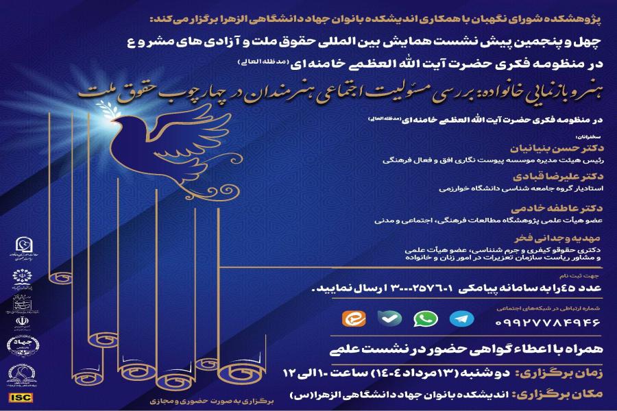 چهل و پنجمین پیش نشست همایش بین المللی حقوق ملت و آزادی های مشروع در منظومه فکری حضرت آیت الله العظمی خامنه ای (مدظله العالی) با موضوع: «هنر و بازنمایی خانواده: بررسی مسئولیت اجتماعی هنرمندان در چهارچوب حقوق ملت»