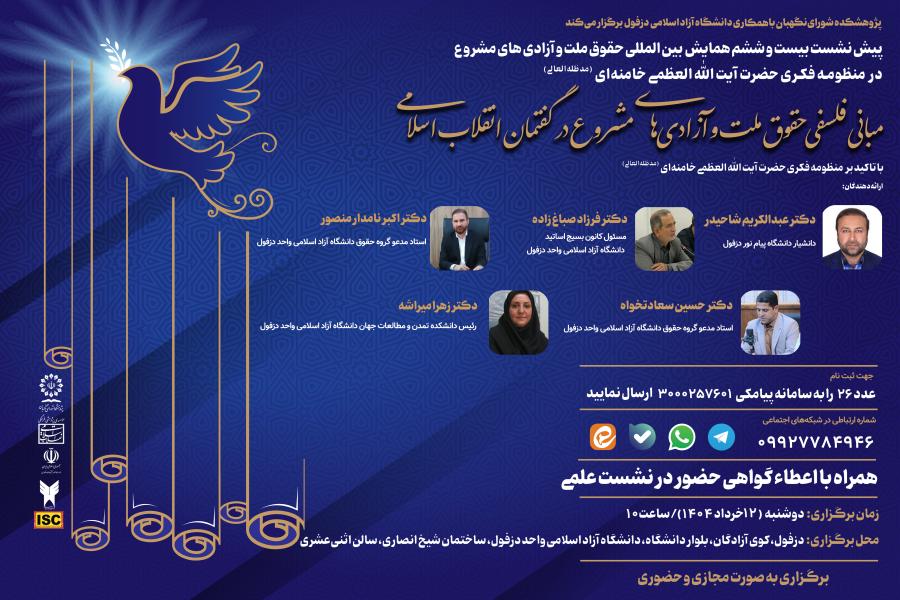 پژوهشکده شورای نگهبان با همکاری دانشگاه آزاد اسلامی واحد دزفول برگزار میکند: پیش نشست بیست و ششم همایش بین المللی حقوق ملت و آزادی های مشروع در منظومه فکری حضرت آیت الله العظمی خامنه ای (مدظله العالی) با موضوع:مبانی فلسفی حقوق ملت و آزادی های مشروع در گفتمان انقلاب اسلامی با تاکید بر منظومه فکری حضرت آیت الله العظمی خامنه ای (مدظله ...
