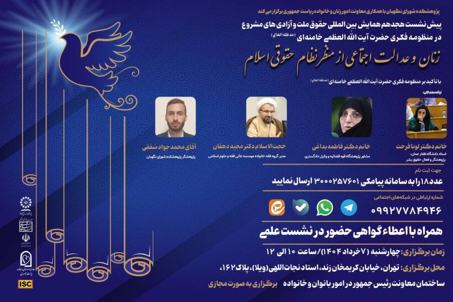 پژوهشکده شورای نگهبان با همکاری معاونت امور زنان و خانواده ریاست جمهوری برگزار میکند: پیش نشست هجدهم همایش حقوق ملت و آزادیهای مشروع در منظومه فکری حضرت آیت الله العظمی خامنه ای (مدظله العالی) با موضوع:زنان و عدالت اجتماعی از منظر نظام حقوقی اسلام با تاکید بر منظومه فکری حضرت آیت الله العظمی خامنهای (مدظله العالی) ...