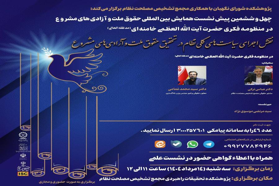 چهل و چهارمین پیش نشست همایش بین المللی حقوق ملت و آزادی های مشروع در منظومه فکری حضرت آیت الله العظمی خامنه ای (مدظله العالی) با موضوع: «تضمین آزادی های فردی و اجتماعی در منظومه فکری حضرت آیت الله خامنه ای (مدظله العالی)»