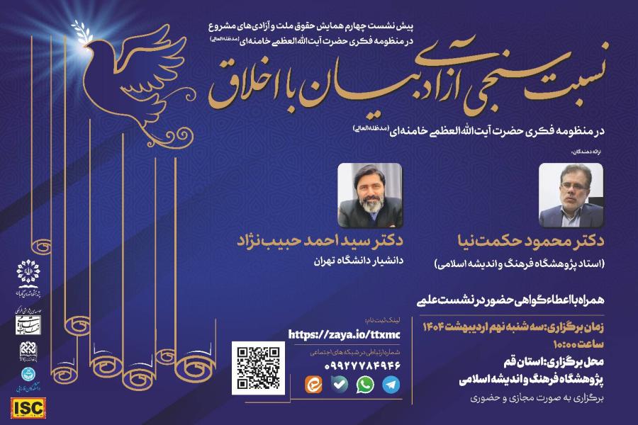 چهارمین پیشنشست همایش بینالمللی حقوق ملت و آزادیهای مشروع در منظومه فکری حضرت آیتالله خامنهای (مدظلهالعالی) با عنوان نسبتسنجی آزادی بیان با اخلاق برگزار میگردد.