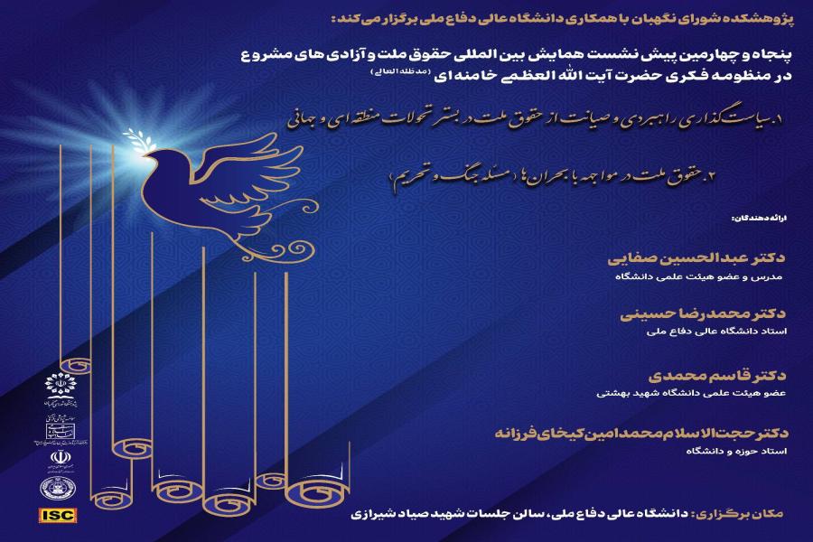 پنجاه و پنجمین پیش نشست همایش بینالمللی حقوق ملت و آزادیهای مشروع در منظومه فکری حضرت آیت الله العظمی خامنه ای (مدظله العالی) با موضوع: «منظومه فکری حضرت آیت الله العظمی خامنه ای (مدظله العالی) در زمینۀ حقوق ملت و آزادی های مشروع: تطبیق با اصول حقوق بشر در عرصۀ بین الملل و چالش های جهانی سازی»