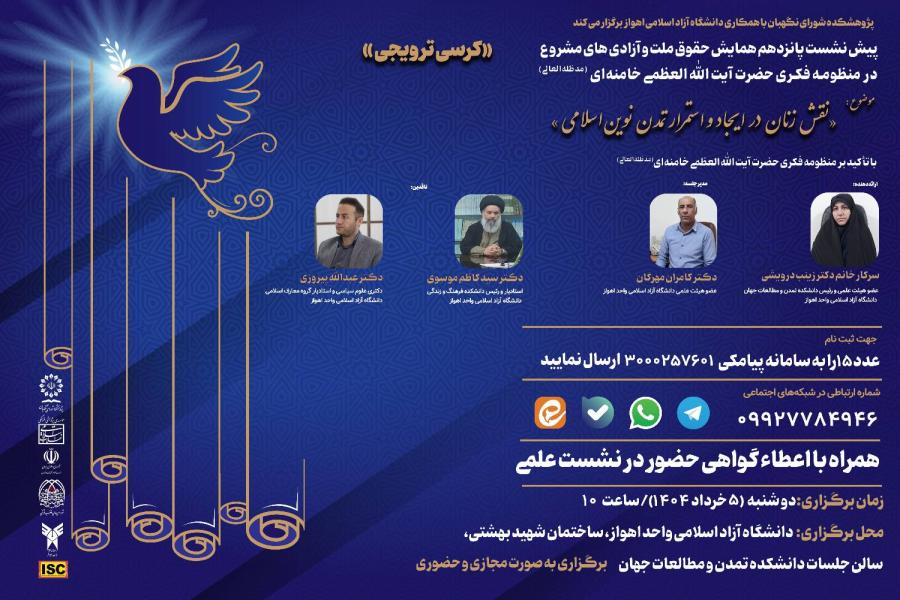 پژوهشکده شورای نگهبان با همکاری دانشگاه آزاد اسلامی واحد اهواز برگزار میکند: پیش نشست پانزدهم همایش حقوق ملت و آزادیهای مشروع در منظومه فکری حضرت آیتاللهالعظمی خامنهای(مدظلهالعالی) در قالب *کرسی ترویجی* باموضوع:«نقش زنان در ایجاد و استمرار تمدن نوین اسلامی در منظومه فکری حضرت آیتالله خامنهای مدظله العالی» ...