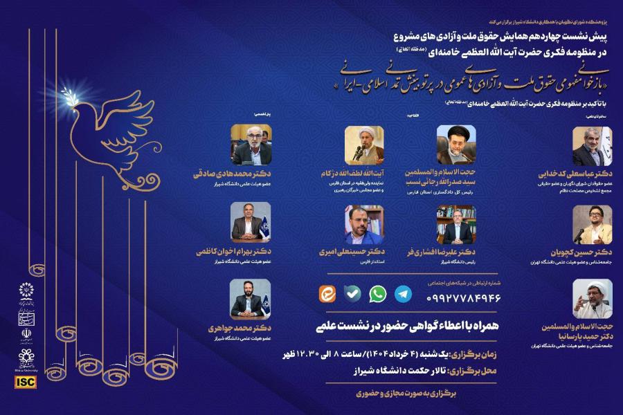 پژوهشکده شورای نگهبان با همکاری دانشگاه شیراز برگزار میکند: پیش نشست چهاردهم همایش حقوق ملت و آزادیهای مشروع در منظومه فکری حضرت آیتاللهالعظمی خامنهای(مدظلهالعالی) با موضوع:بازخوانی مفهومی حقوق ملت و آزادیهای عمومی در پرتو بینش تمدنی اسلامی-ایرانی ...