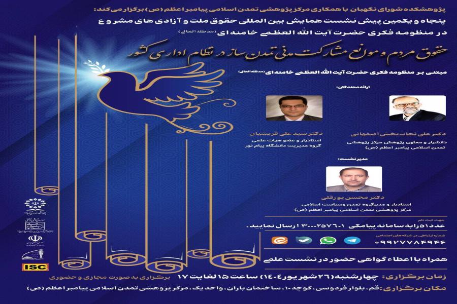 پنجاه و یکمین پیش نشست همایش بین المللی حقوق ملت و آزادی های مشروع در منظومه فکری حضرت آیت الله العظمی خامنه ای (مدظله العالی) با موضوع: «حقوق مردم و موانع مشارکت مدنی تمدن ساز در نظام اداری کشور مبتنی بر منظومه فکری حضرت آیت الله العظمی خامنه ای (مدظله العالی)»