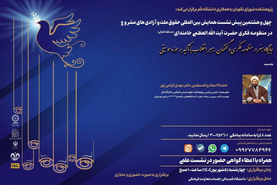 چهل و هشتمین پیش نشست همایش بین المللی حقوق ملت و آزادی های مشروع در منظومه فکری حضرت آیت الله العظمی خامنه ای (مدظله العالی) با موضوع: «جایگاه هنر در منظومه فکری و گفتمان رهبر انقلاب با تأکید بر حوزه موسیقی»