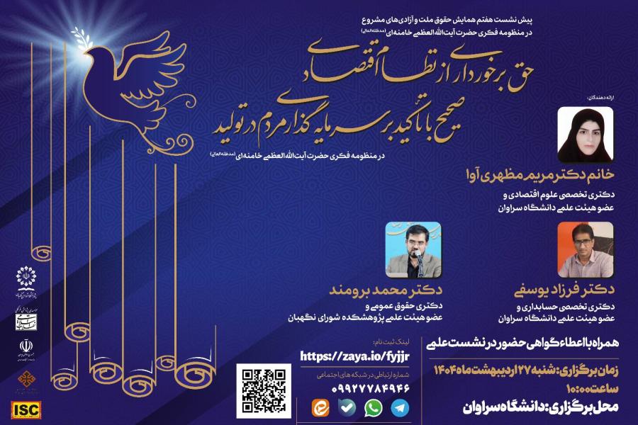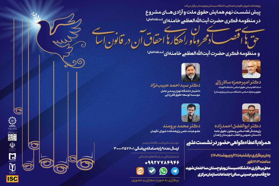پژوهشکده شورای نگهبان با همکاری دانشگاه سیستان و بلوچستان برگزار میکند: پیش نشست نهم همایش حقوق ملت و آزادیهای مشروع در منظومه فکری حضرت آیتاللهالعظمی خامنهای(مدظلهالعالی): نشست علمی «حقهای اقتصادی محرومان و راهکارهای احقاق آن در قانون اساسی و منظومه فکری مقام معظم رهبری» ...