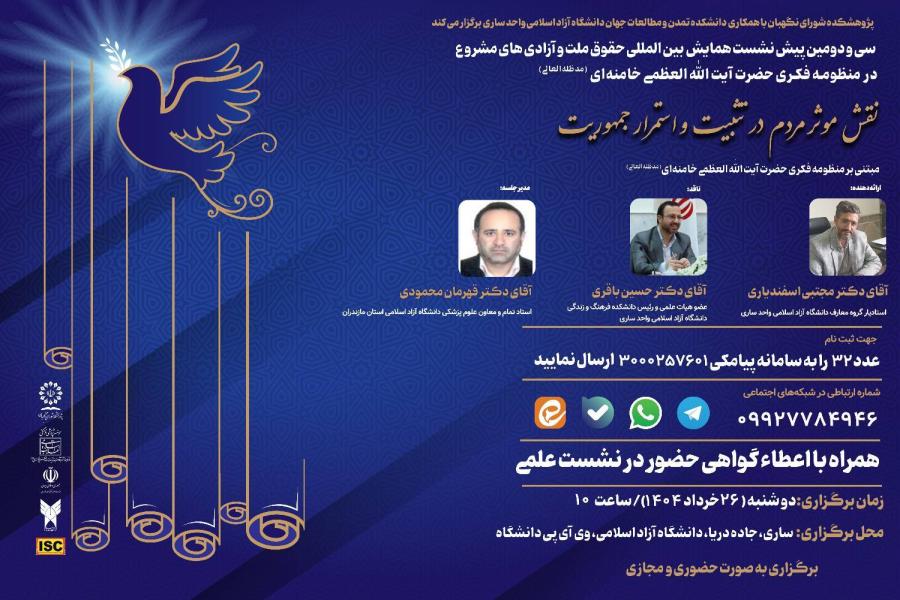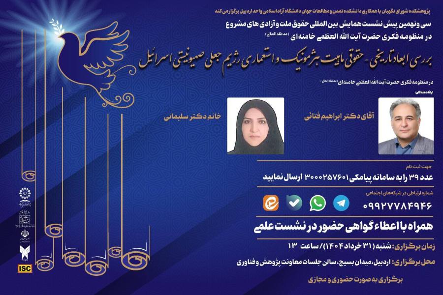 دکتر زهرا میراشه، رئیس دانشکده تمدن و مطالعات جهان دانشگاه آزاد اسلامی واحد دزفول، در پیشنشست بیست و ششم همایش بینالمللی حقوق ملت و آزادیهای مشروع با موضوع مبانی فلسفی حقوق ملت و آزادیهای مشروع در گفتمان انقلاب اسلامی که در تاریخ 12 خردادماه 1404 برگزار شد، به تحلیل دیدگاههای مقام معظم رهبری در خصوص حقوق ملت و آزادیهای مشروع پرداخت و بر جایگاه ویژه این حقوق در ن ....jpg)