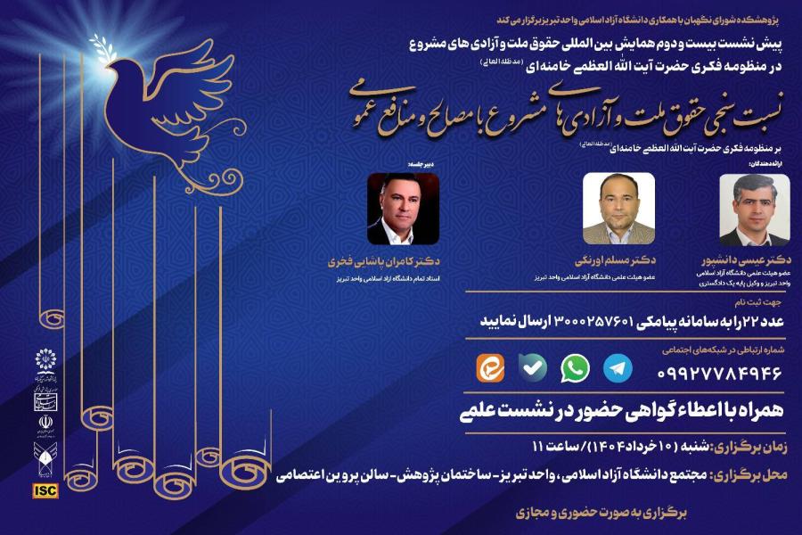 پژوهشکده شورای نگهبان با همکاری دانشگاه آزاد اسلامی واحد تبریز برگزار میکند: پیش نشست بیست و دوم همایش بینالمللی حقوق ملت و آزادیهای مشروع در منظومه فکری حضرت آیتاللهالعظمی خامنهای(مدظلهالعالی) باموضوع:نسبت سنجی حقوق ملت و آزادیهای مشروع با مصالح و منافع عمومی ...