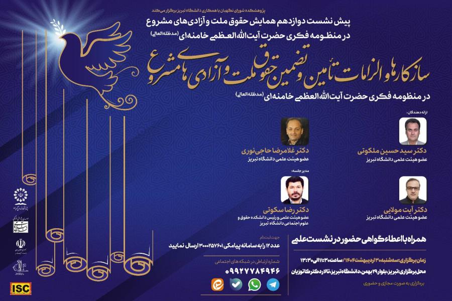 پیش نشست دوازدهم همایش حقوق ملت و آزادیهای مشروع در منظومه فکری حضرت آیت الله العظمی خامنهای (مدظله العالی) با موضوع: « سازکارها و الزامات تأمین و تضمین حقوق ملت و آزادیهای مشروع در منظومه فکری مقام معظم رهبری»