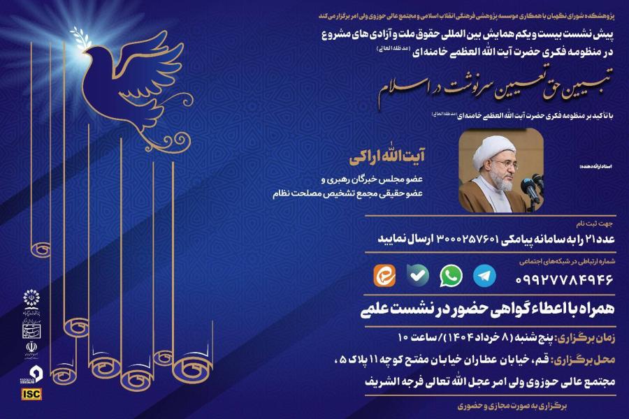 پژوهشکده شورای نگهبان با همکاری موسسه پژوهشی فرهنگی انقلاب اسلامی و مجتمع عالی حوزوی ولی امر برگزار میکند: پیش نشست بیست و یکم همایش بینالمللی حقوق ملت و آزادیهای مشروع در منظومه فکری حضرت آیتاللهالعظمی خامنهای(مدظلهالعالی) باموضوع: «تبیین حق تعیین سرنوشت در اسلام با تاکید بر منظومه فکری رهبر معظم انقلاب اسلامی» ...