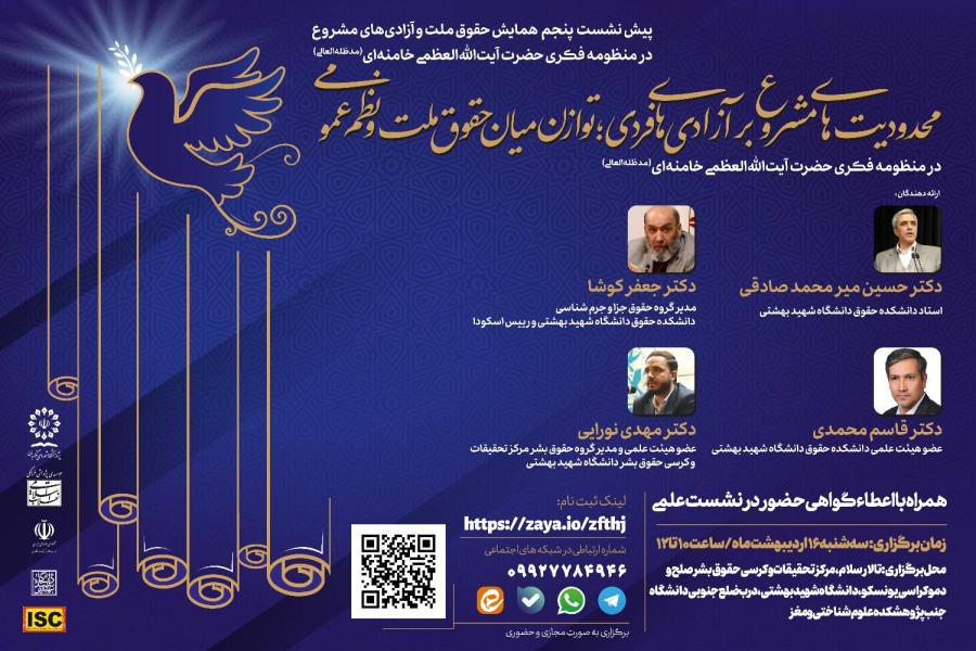 پیش نشست پنجم همایش حقوق ملت و آزادیهای مشروع در منظومه فکری حضرت آیت الله العظمی خامنهای (مدظله العالی) با موضوع: محدودیتهای مشروع بر آزادیهای فردی؛ توازن میان حقوق ملت و نظم عمومی در منظومه فکری حضرت آیت الله العظمی خامنهای (مدظله العالی)» ...